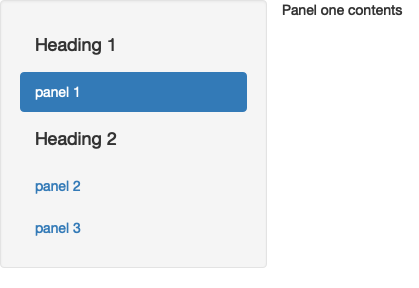 Genera una “tabla de contenidos” vertical. Se declara que sea una lista con navlistPanel() y se agregan los títulos y sus pestañas con tabPanel().